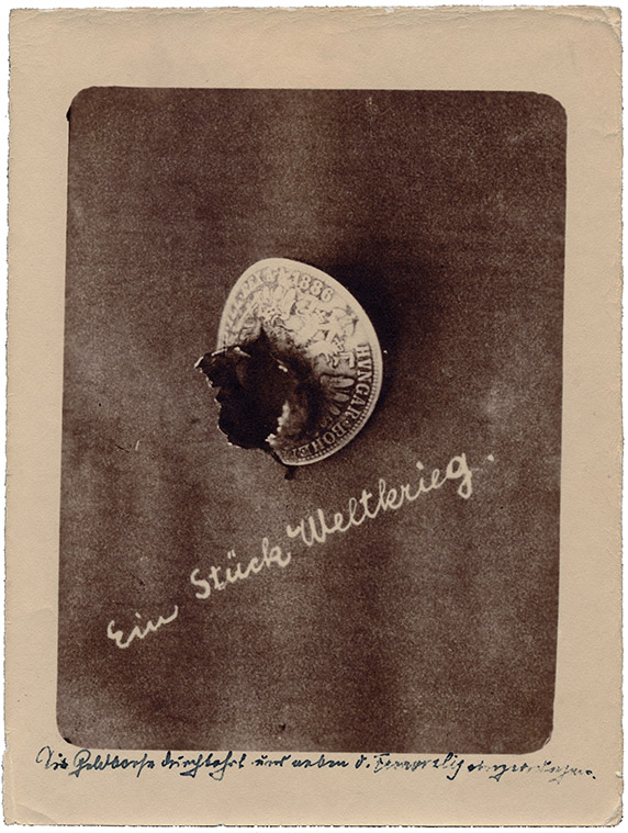 10:7 zerstörung copy ← Vorherige Nächste → Ein Stück Weltkrieg, durchschossene Münze um 1915, Gelatinabzug © Milaneum 2018