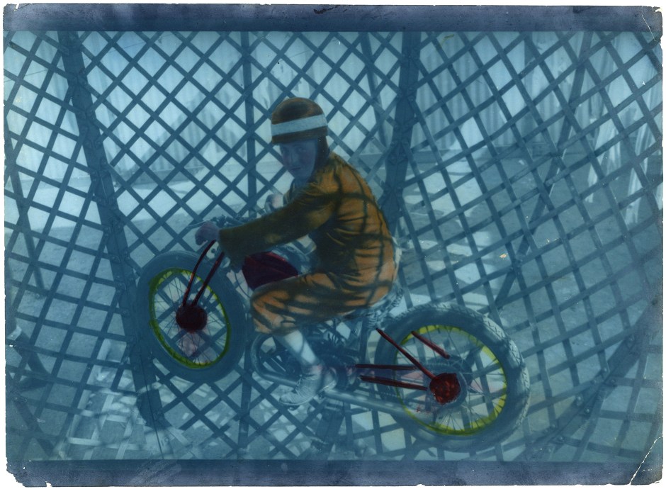 Die Todeskugel ← Vorherige Nächste → Die Todeskugel / Looping the Loop / Speedwell sans egal, Jezdec smrti, der Todesfahrer am Motorrad im Globus. Foto Singer, Košice, Legionárské nám, Vedle Bio rádio, Poland ca. 1925, colored silver gelatine print, 24 x 30 cm ©Milaneum 2019