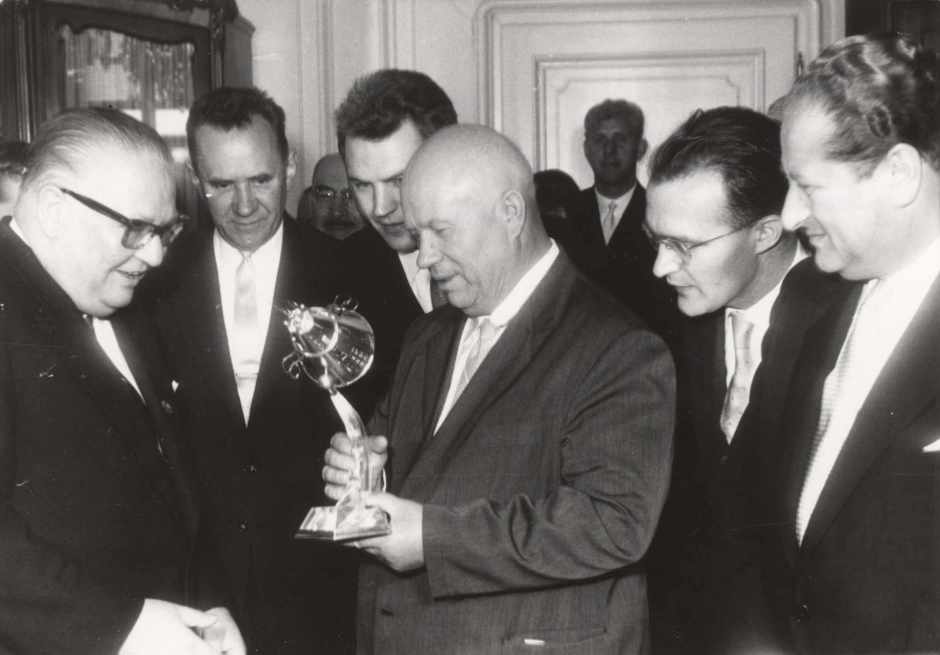 pressefotos44 copy ← Vorherige Nächste → Nikita Chruschtschow präsentiert die Sojus-Rakete beim Gipfeltreffen mit John Kennedy 3.-4.6.1961, Vintage Silbergelatinabzug, 13×18 cm