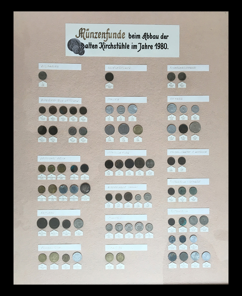 Münzenfunde beim Abbau alter Kirchstühle 1980, Slg. Mila Palm