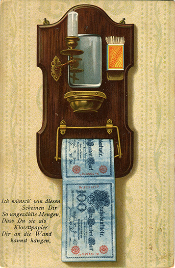 Klopapier ← Vorherige Nächste → Postkarte um 1900, Banknoten als Klopapier, Lithographie © Milaneum 2018