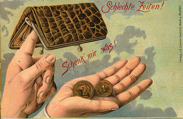 Postkarte um 1900, Schlechte Zeiten, Lithographie © Milaneum 2018